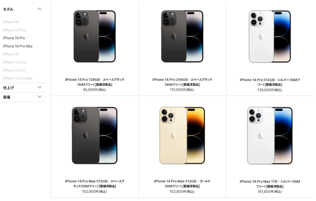 iPhone 14Proシリーズ 整備済製品 95,800~181,800円(税込)