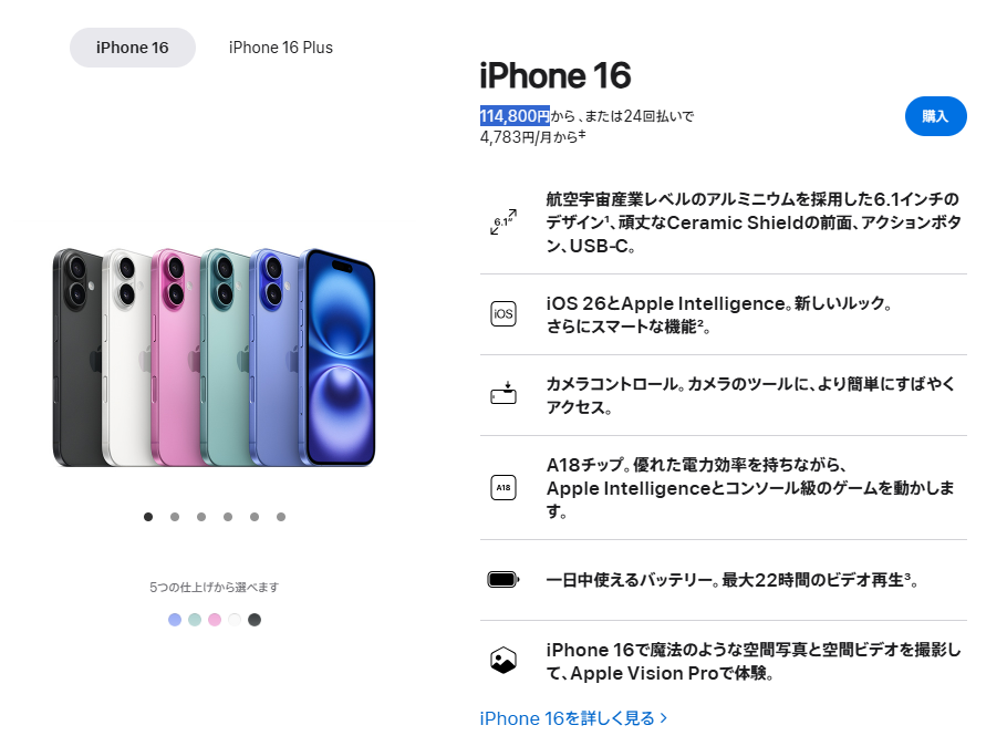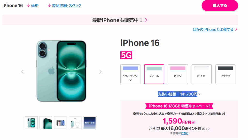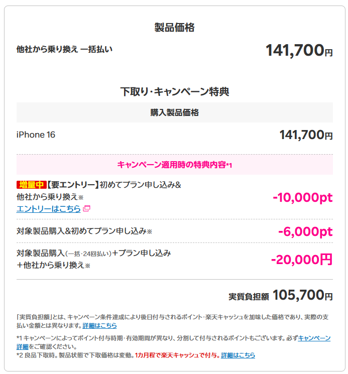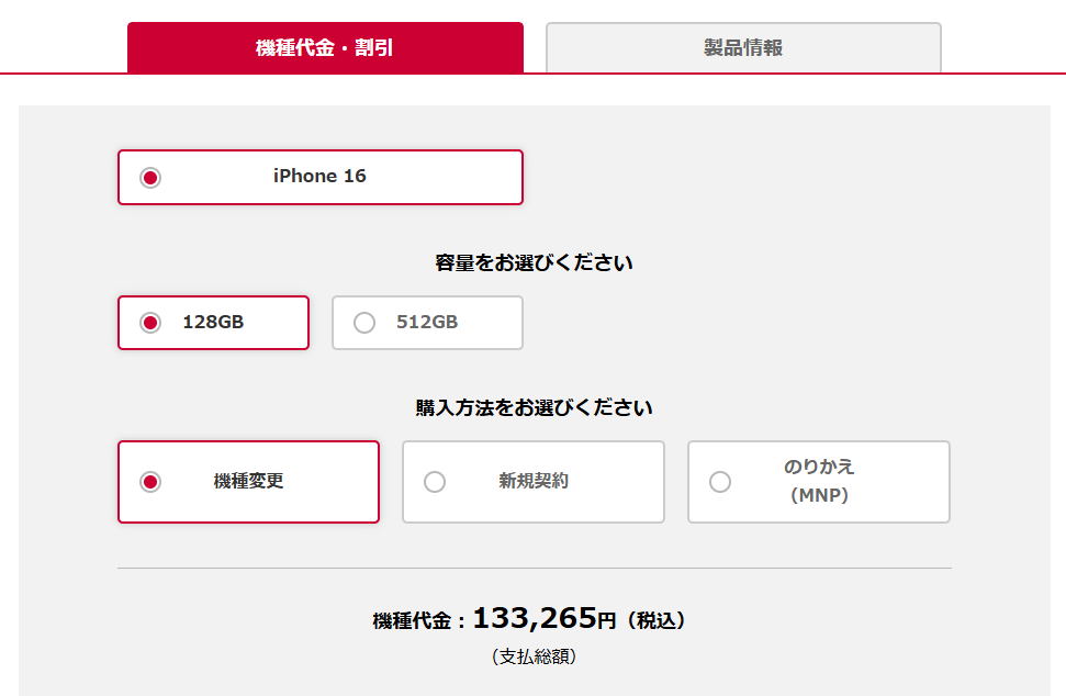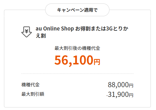 のりかえ(MNP)の場合は割引(-31,900円)が適用され56,100円です。
