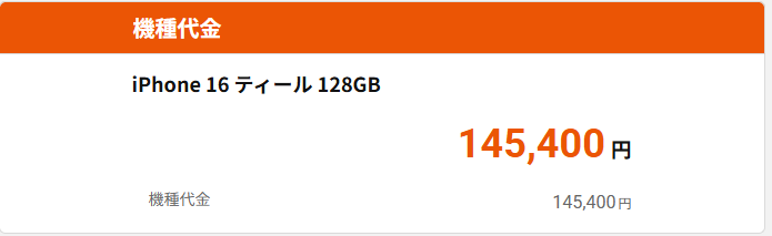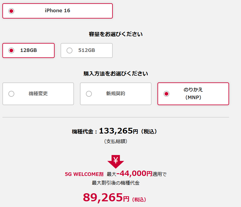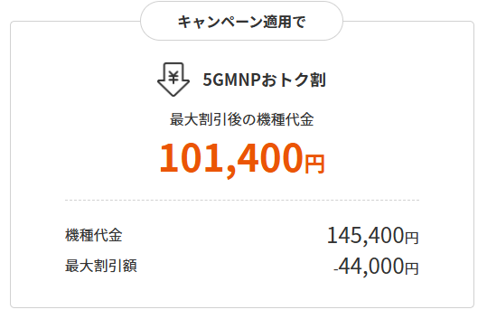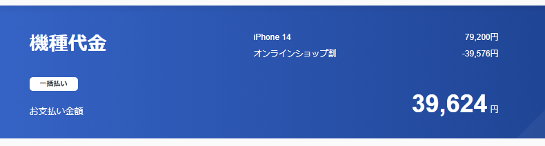 のりかえ(MNP)の場合はオンラインショップ割引(-39,576円)が適用され39,624円です。
