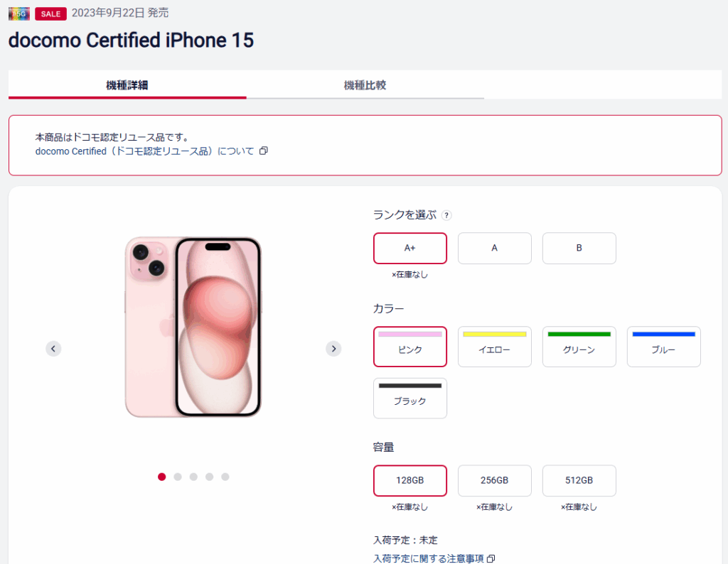 docomo Certified iPhone 15 128GB 93,500円(税込)