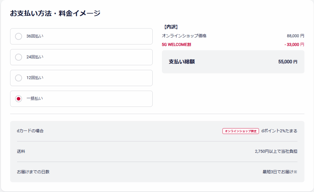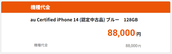 のりかえ(MNP)の場合は割引(-33,000円)が適用され55,000円です。