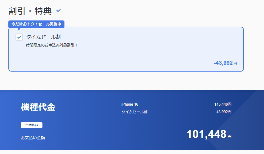 ※このタイムセール割の条件が不明ですが、MNPを選択したら出てきました